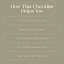 This checklist is ideal for anyone looking to add a moment of calm and grounding to their day—busy professionals, students, parents, or anyone who feels scattered and wants an easy way to regain focus. Unlike other digital resources, this guide is short, entertaining, and practical, making it easy to actually use.