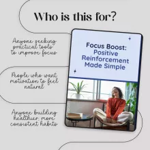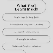 Unlock the secret to staying motivated and sharp with Focus Boost: Positive Reinforcement Made Simple. This digital guide shows you exactly how to use positive reinforcement to stay focused, using simple techniques and practical examples anyone can follow. Whether you struggle with procrastination, lose concentration easily, or simply want a proven system for building lasting focus, this resource gives you clear steps and even AI-powered prompts to make it happen.