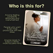 Do you ever feel like your brain is juggling a dozen tabs at once, making it impossible to concentrate on the task right in front of you? In our hyper-connected world, constant distractions are stealing our attention and productivity. “Focus in the Moment” is your essential guide to cutting through the noise. This isn’t just another eBook; it’s a practical toolkit designed to help you train your mind for unwavering focus and a calmer, more present state of being. Discover powerful mindfulness practices for better focus that you can seamlessly integrate into your busy life, starting today.