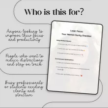 Unlike other generic productivity guides, the Laser Focus: Your Mental Clarity Checklist is designed with practical, actionable steps that you can easily implement into your daily routine. With clear instructions, focused techniques, and tips tailored to optimize both your mindset and environment, this digital resource is everything you need to build long-term habits that lead to success.