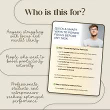 Are you tired of feeling distracted and unproductive when tackling important tasks? “Quick & Smart Ways to Power Focus Before Any Task” is a digital guide designed to help you achieve laser-sharp focus through proven pre-task strategies. This comprehensive resource provides step-by-step tips on food, hydration, mindfulness, and the latest AI tools to optimize your brain function. Whether you’re preparing for a big presentation, a creative project, or just your everyday tasks, this guide will empower you to power through your to-do list with ease.