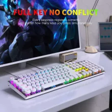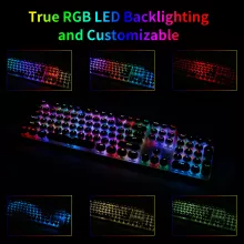 With its round typewriter-style keycaps and sleek metal top panel, this keyboard adds a touch of sophistication to any desk setup. The durable double-shot ABS keycaps ensure that letters never fade, while the splash-proof design keeps it safe from everyday spills. The sturdy non-slip base provides stability even during intense gaming sessions. Its full-size 104-key layout includes a numeric keypad, perfect for both office use and gaming.