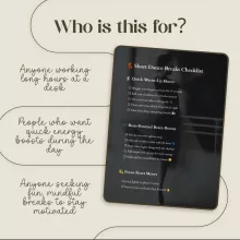 This digital checklist is perfect for anyone who spends long hours sitting, working, or studying and needs a creative, energizing way to stay focused. Whether you’re a student cramming for exams, a remote worker battling afternoon slumps, or a creative looking for fresh inspiration, the Short Dance Breaks Checklist is your go-to resource for productivity and joy.