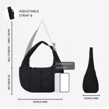 Featuring an adjustable shoulder strap, this bag adapts to your preferred carrying style—wear it as an underarm bag for a sleek, minimalist look, or sling it over your shoulder for easy, hands-free comfort. The soft silk cotton padding ensures it feels light and comfortable even when full, making it ideal for long days on the go.